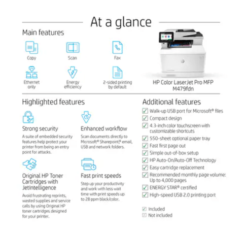 | In The Box | HP Color LaserJet Pro MFP M479fdn, Black Starter Toner Cartridge (2400 Pages), CMY Starter Toner Cartridges (1200 Pages), Manuals and Documentation, Warranty Card, Power Cord |