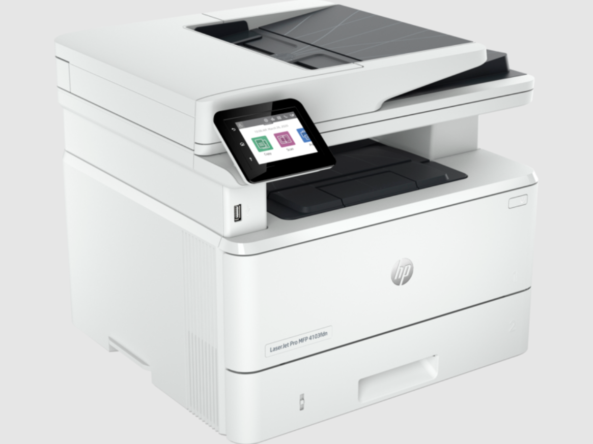 HP LaserJet Pro MFP 4103fdn Printer; Preinstalled HP Black Original LaserJet Toner Cartridge (3,050 pages); Getting Started Guide; Support Flyer; Regulatory Flyer; Power cord |