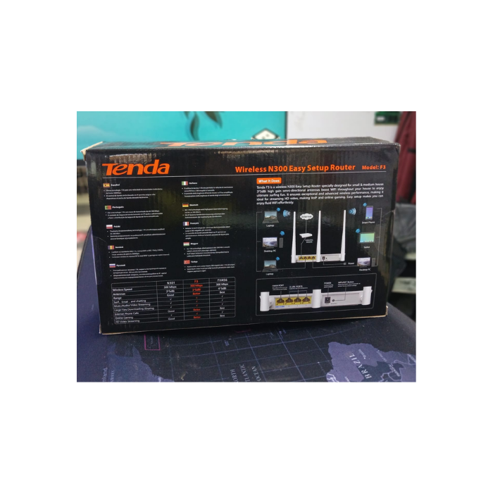 The Tenda F3 N300 300Mbps Wireless Router is specially designed for your smart home networking life. The Tenda router uses a superior Advanced Chip ensures stable and fast wireless performance, making it ideal for streaming music, uploading photos, video chatting, HD video streaming and other bandwidth-intensive tasks.