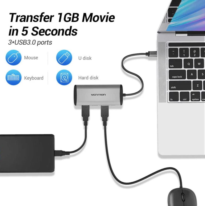 The Vention USB-C Multi-Functional 5 in 1 Docking Station (VEN TGDHB) is a versatile and portable solution that allows you to expand the connectivity options of your USB-C enabled device, such as a laptop or a tablet. The docking station provides multiple ports for connecting various peripherals and displays, making it ideal for productivity and entertainment purposes.